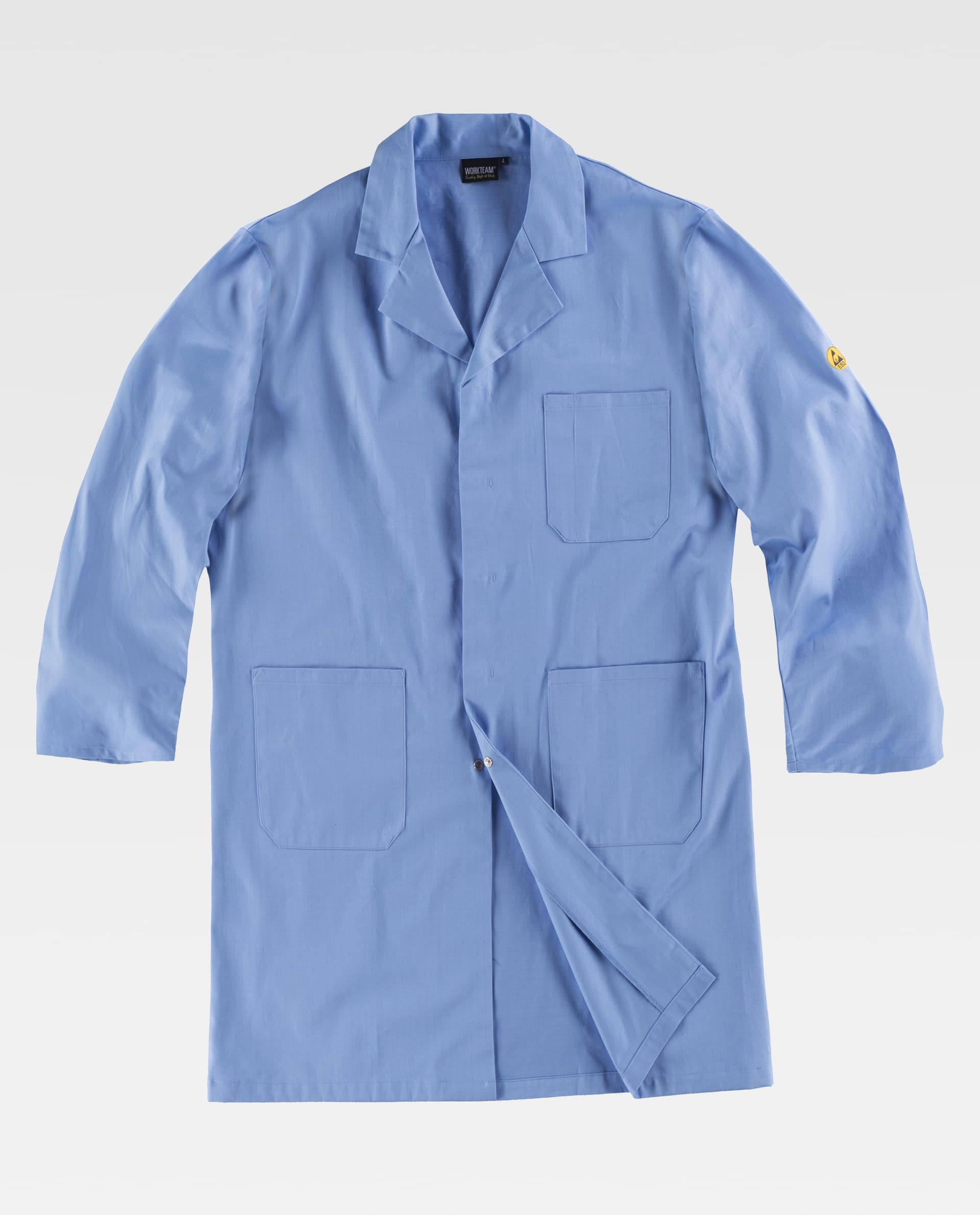 Bata ESD con cuello solapa y cierre central de corchetes ocultos.