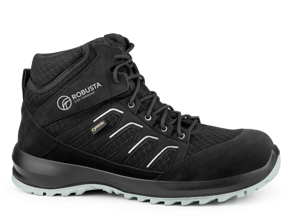 Bota de seguridad ligera y comoda en serraje nubuck y rejilla textil de alta tenacidad,con forro GoreTex. Con suela PU y caucho nitrilo.Puntera y plantilla no metalica.