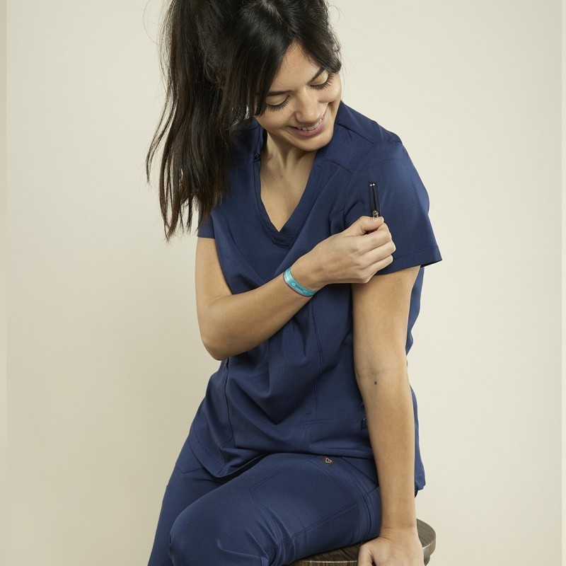 Linea pressence. Tejido antibacteriano e iones de plata. Casaca de mujer elástica con buena caida y facil planchado, de corte entallado y cuello en v.