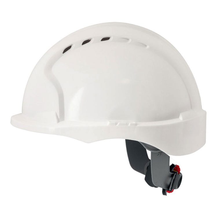 Casco ventilado de polietileno de alta densidad, con ajuste de ruleta y visera corta. Banda de sudoración de cuero Nomaz.