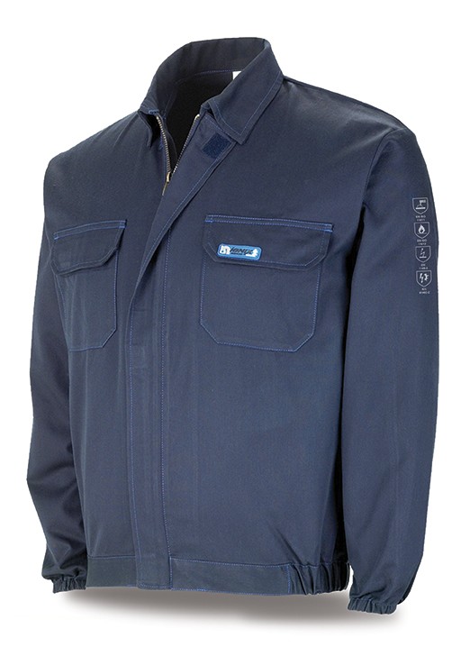 Chaqueta ignífuga y antiestática con protección contra calor y llama, soldeo y procesos afines y los efectos térmicos del arco eléctrico. Cuello camisero. Ajuste elástico en cintura. Ajuste elástico en puños.