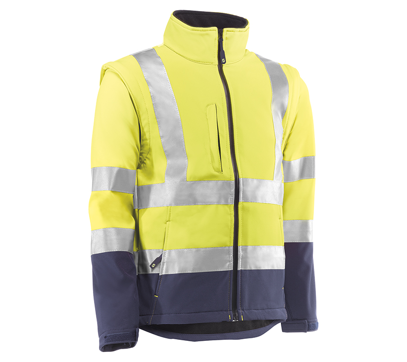 Chaqueta cortavientos (softshell) de alta visibilidad con mangas desmontables en azul marino y amarillo flúor.