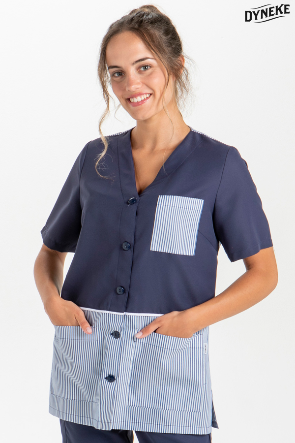Chaqueta de limpieza en tono azul marino combinado con rayas.
