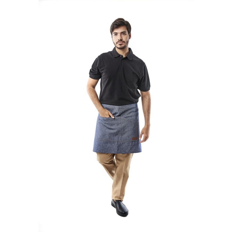 Ddelantal medio o corto, tipo denim vaquero, es una excelente opción para aquellos que buscan estilo y funcionalidad. Con un bolsillo central en ante de corte asimétrico y cintas de espiga de algodón, este delantal es perfecto para profesionales que necesitan un toque de estilo en su uniforme.