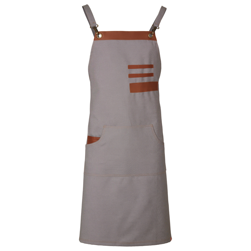 Delantal peto con ajuste al cuello mediante cinta y mosquetón, y ajuste a la cintura con cinta anudable para comodidad personalizada.